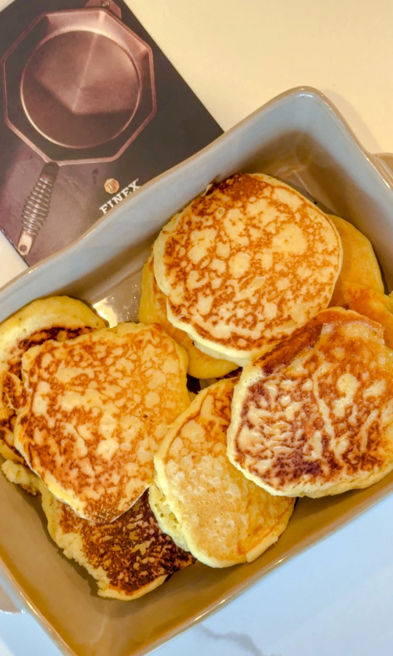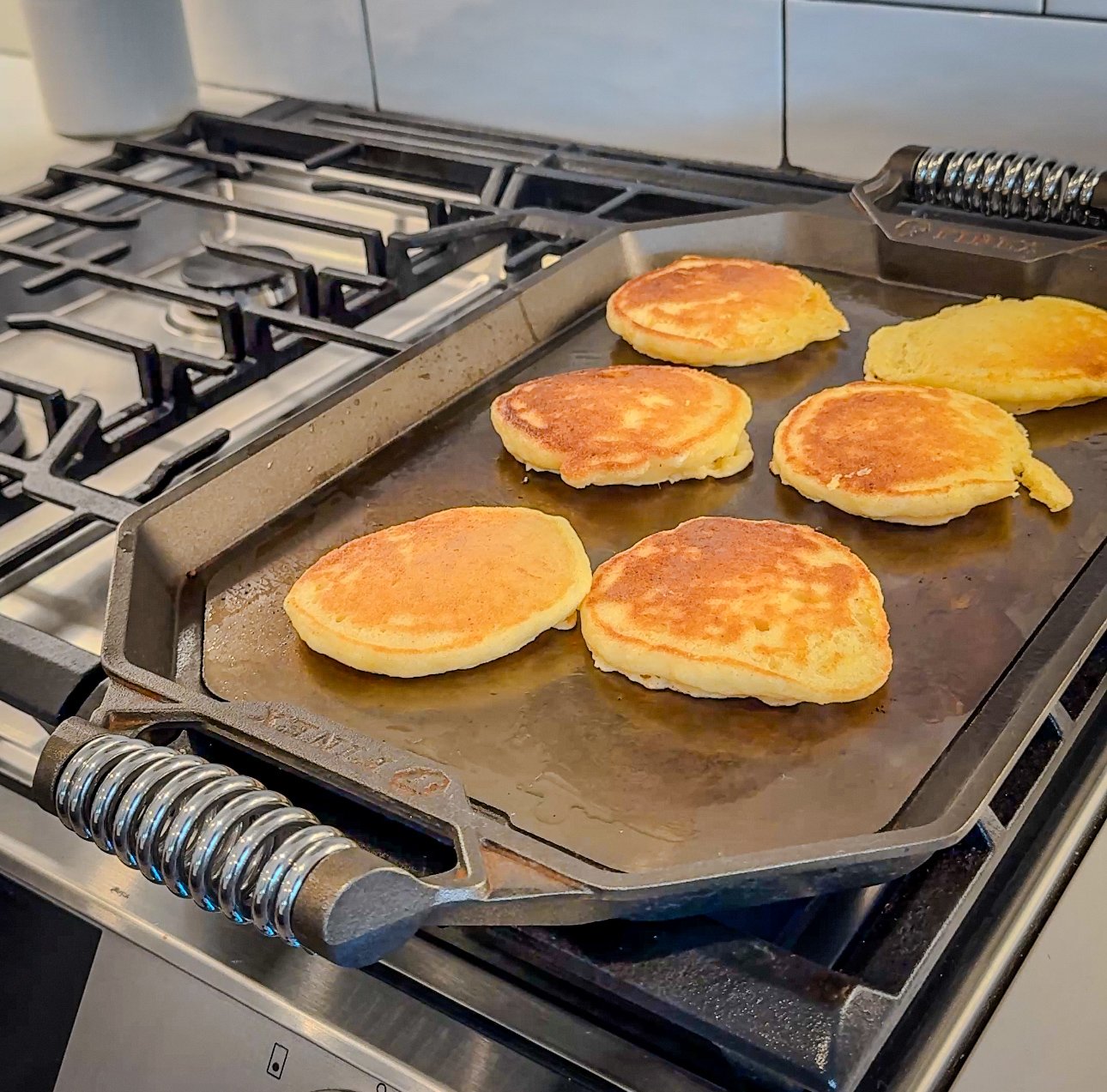 Preheat a griddle or skillet over medium heat. Pour in enough oil to coat the cooking surface, then portion/scoop batter out to form 3” rounds. Once edges appear to be firm and cooked through, flip. Cook until golden brown on both sides, flipping as needed.